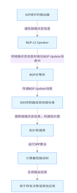 BGP-LS-SPF的工作过程可分为“信息收集、拓扑构建、路径计算、路径部署”四个阶段,具体如下: